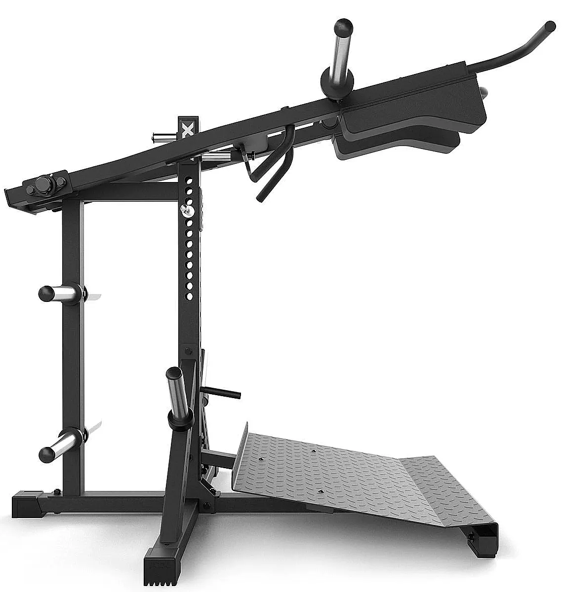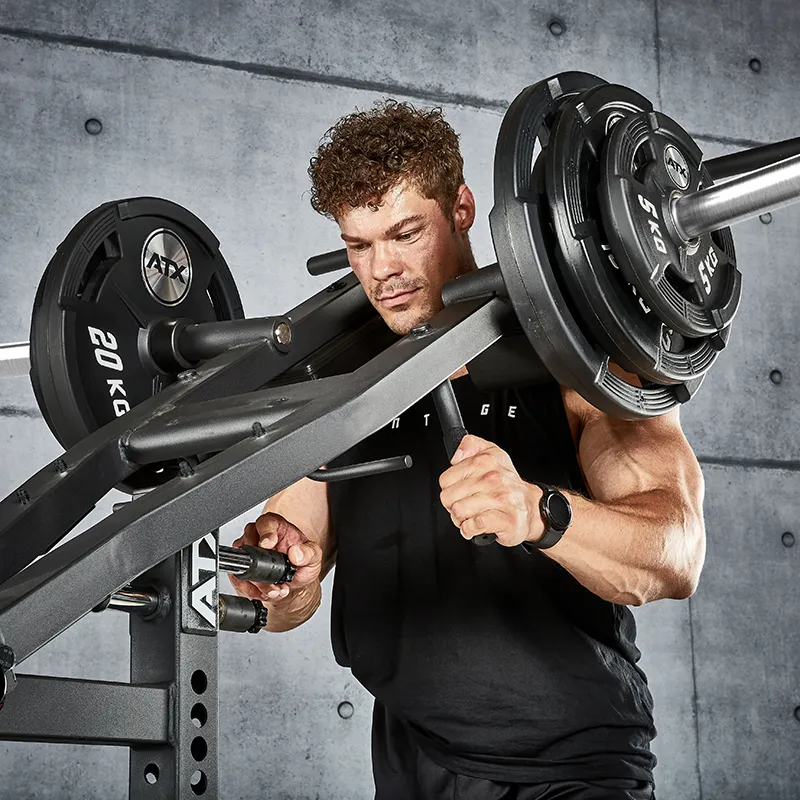 Die hervorragende Biomechanik gewährt maximale Effizienz der Kniebeugeübung. Das 90 cm breite Fußblech