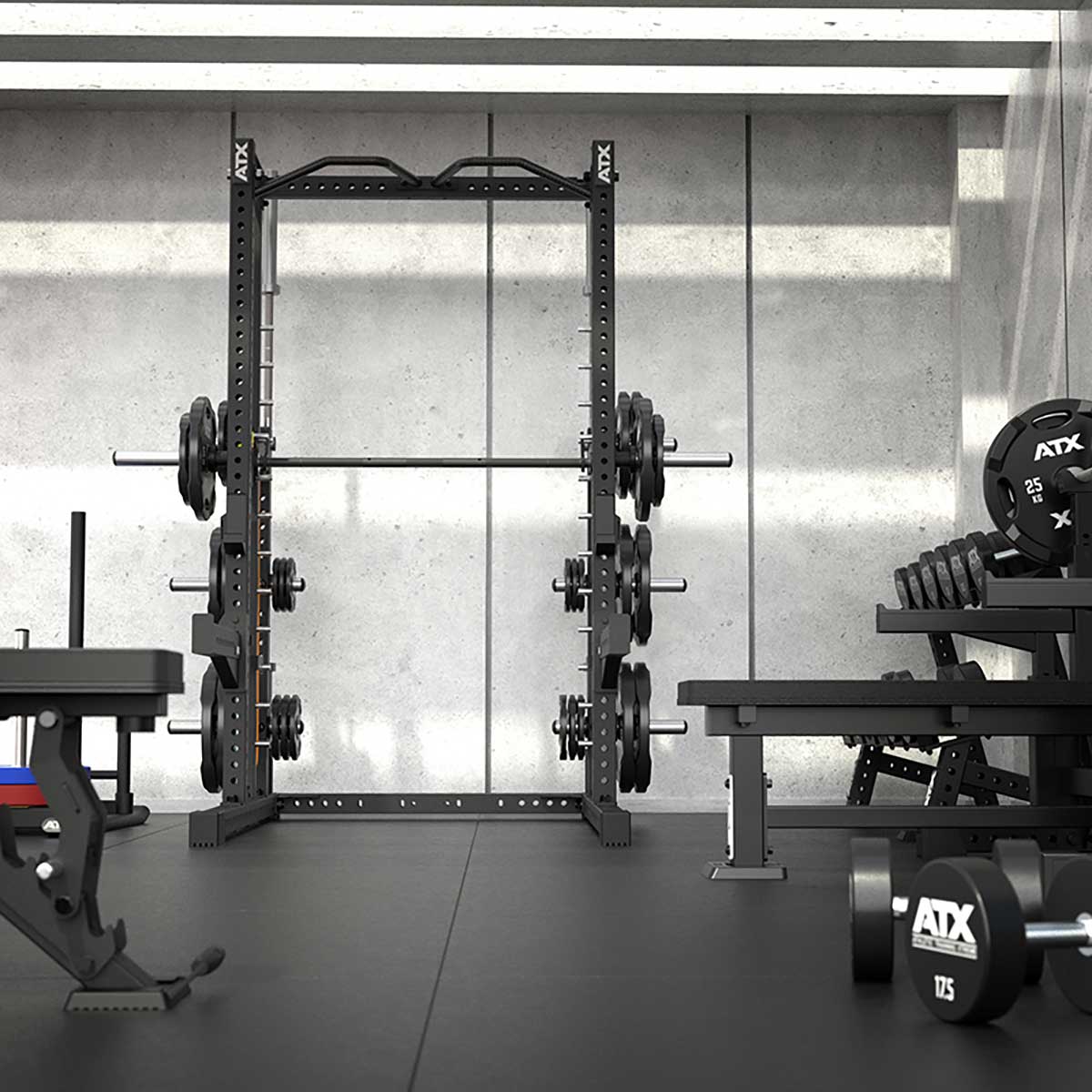 Alle relevanten Langhantelübungen können wahlweise frei am stabilen Half Rack oder präzise geführt an der seidenweich laufenden Multipresse ausgeführt werden.