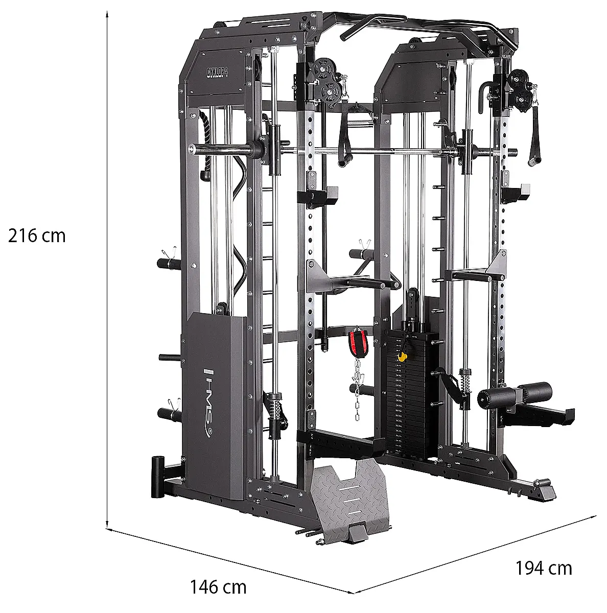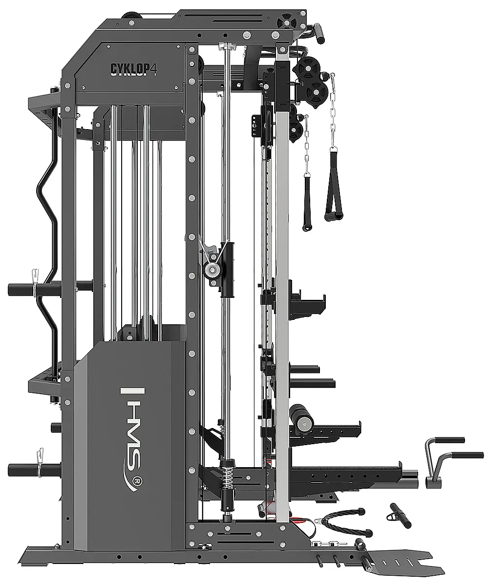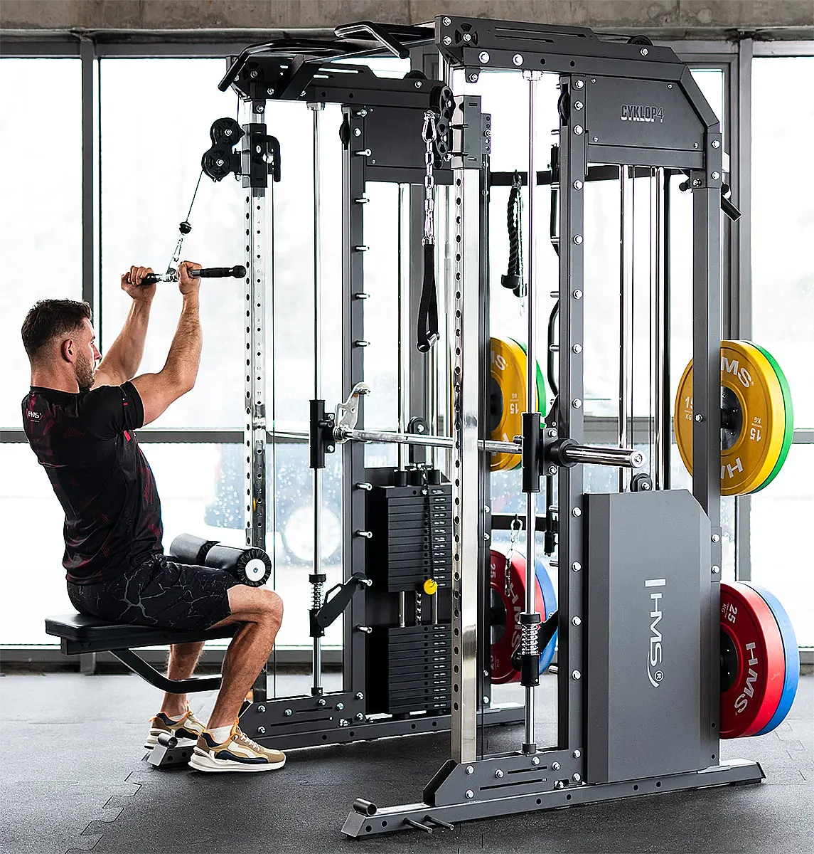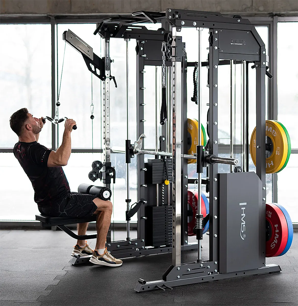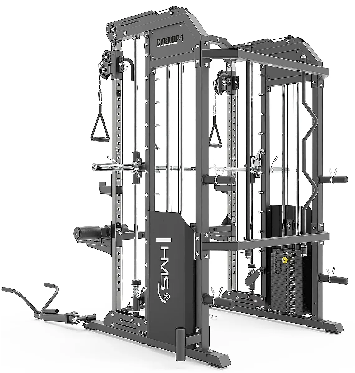 Der CYKLOP 4 von HMS vereint die Vorteile einer Multipresse (Smith Machine), einer vollwertigen Kraftstation und eines funktionalen Kabelzug-Systems – und bietet dir damit ein komplettes Fitnessstudio in nur einem Gerät.