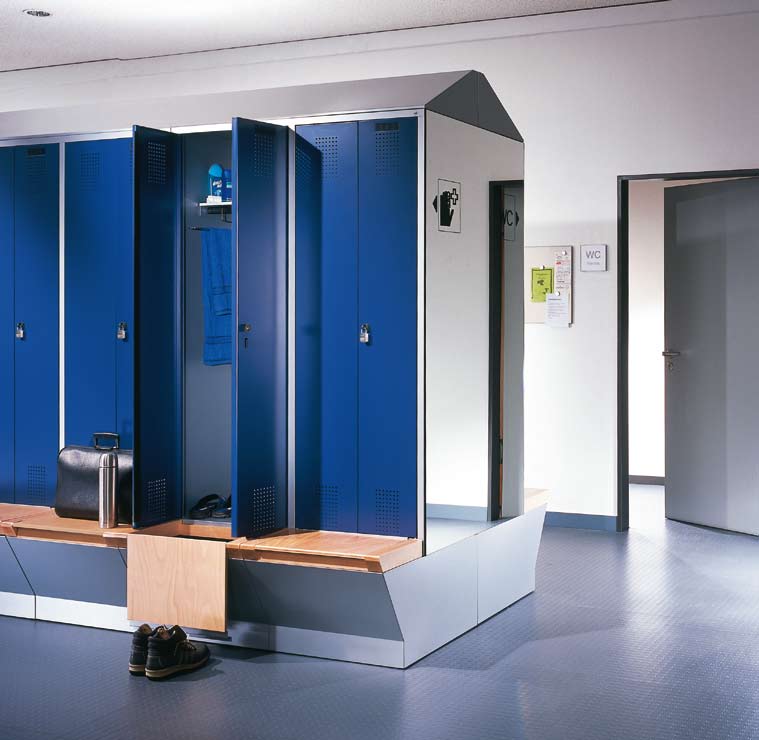 Umkleiden in Industrie und Gewerbe – ein Kapitel für sich! Neben der Einhaltung von Arbeitsstättenrichtlinien können unterschiedlichste Aufgabenstellungen anstehen: Trennung von Straßen- und Berufskleidung, Zwangsentlüftung, zusätzlicher Stauraum, spezielle Hygienevorschriften oder die Versiegelung des Bodenanschlusses für maschinelle Reinigung. All dies bewältigt Evolo bequem aus dem Serienprogramm. Und sieht dazu noch hervorragend aus.