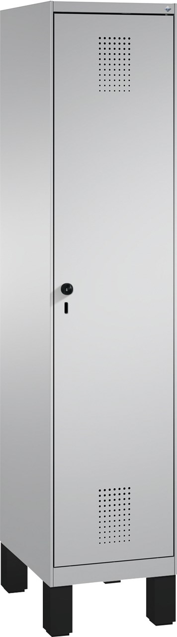 Wandhängende Schränke, Stahl- und Dekorfronten kombiniert, unterschiedliche Fachgrößen, offene Garderobenlösungen, 90°-Ecken mit passender Verblendung, verschiedene Verschlussund Beschriftungsoptionen und vieles mehr – allein diese Bilder zeigen, was mit Evolo alles möglich ist!Fächerschränke und offene Garderoben: Ideal als Ergänzung und für Bereiche, in denen sich nicht umgekleidet werden muss (z.B. im Büro).
