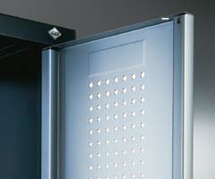 - Türen rechts angeschlagen, in Drehbolzen gelagert, oben und unten mit je 1 Lochrosette, eingestanztem Etikettenrahmen und Drehriegelverschluss für Vorhangschloss